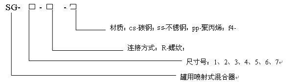 SG系列灌用噴射式試用范圍廣闊,作為一個依據(jù),可以說,只要用離心泵可以傳送翻轉(zhuǎn)液體,就可以用這種混合器。其主要用于容器、貯存罐和中河池,如油品調(diào)和,酸堿中和反應(yīng)等工藝,實為理想的混合設(shè)備。  型號標注