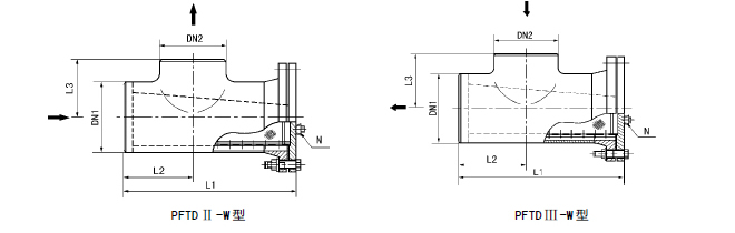 | (4)T型對焊連接正折流式過濾器(PFT II—W型)(DN50~400,PN≤5.OMPa) (5)T型對焊連接反折流式過濾器(PFT III—W型)(DN50~400,PN≤5.OMPa) PFTII-W,PFTIII-W型