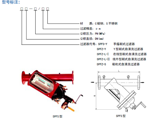 手搖刷式過濾器(SPFS—Y型) 手搖刷式過濾器是一種簡(jiǎn)單,高效的過濾器。當(dāng)雜質(zhì)在楔形濾網(wǎng)上積聚時(shí),進(jìn)出口會(huì)產(chǎn)生壓差,當(dāng)壓差達(dá)到工藝要求時(shí),便要求清洗。清洗時(shí),無需拆卸過濾器的任何部件,只需打開排污閥,并同時(shí)旋轉(zhuǎn)手把3—4周,便可輕易達(dá)到有效的清洗。 性能特點(diǎn) ※采用節(jié)省空間的精密設(shè)計(jì),線型結(jié)構(gòu)。 ※采用高精度,高強(qiáng)度楔形濾網(wǎng),過濾精度可由100—3000微米。 ※清洗方式簡(jiǎn)單:不銹鋼刷式。 ※反洗時(shí)不斷流。 ※反洗水量極少,不超過總流量的1%。 結(jié)構(gòu)尺寸表