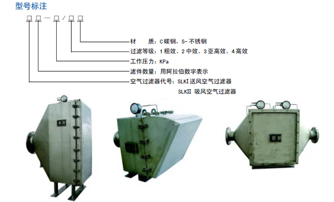 性能特點 ※過濾器濾料為抗斷裂的合成纖維構成的高性能無紡布,無類似玻纖斷裂的危險,降低破漏風險。 ※過濾器濾料為遞增結構,即往純凈空氣方向的纖維層的密度逐漸增大,延長使用壽命。 ※過濾器濾料作粘性處理,因粘劑完全滲透介質而使塵埃粒子無法通過。 ※過濾器過濾風量大,壓力損失小,過濾效率高,運行可靠。 ※多級組合式過濾,適合不同用戶的需要。 ※獨特的濾件快換安裝框設計,使用和維護十分方便。 ※符合環保。濾件不含PVC染色劑和鹵素,能用于食品級過濾。 典型應用 ※燃氣輪機,離心空氣壓縮機進風口過濾。 ※發電廠,食品廠、飲料廠等行業高壓風機進風口過濾 ※制藥、化工、冶金、生物等領域的空氣凈化系統。 ※中央空調新風機組及通風系統。 1、送風空氣過濾器(SLKI型)