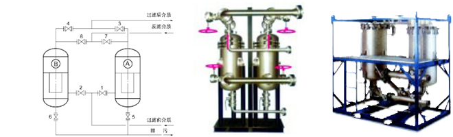 0.3~100 | ■SJFM—II型精細(xì)過濾器應(yīng)用實(shí)例 一煉油行業(yè):各類油品過濾,石蠟過濾; 一“三采”注聚裝置:聚合物過濾、水過濾 一化工行業(yè):各類活性碳過濾、工業(yè)污水過濾、高溫氣體凈化 3、金屬粉末燒結(jié)濾芯精細(xì)過濾器SJFM—III型 SJFM-III型精細(xì)過濾器的核心是微孔粉末燒結(jié)管,具有耐高溫、耐腐蝕、孔徑均勻穩(wěn)定、透氣性好、可清洗再生等特點(diǎn)。用于液體或氣體過濾。 SJFM-III型精細(xì)過濾器適用于過濾精度0.01—100 u m液體、氣體過濾。 SJFM-III型精細(xì)過濾器主要用于導(dǎo)熱油、液壓油過濾,無菌氣體制備。 4、精細(xì)過濾器并聯(lián)切換反沖洗過濾系統(tǒng)SJFM—D 本過濾系統(tǒng)由于采用可清洗再生的金屬濾芯作過濾元件,從而能夠?qū)崿F(xiàn)系統(tǒng)長(zhǎng)期平衡連續(xù)運(yùn)行的目的。其操作方式有手動(dòng)和PLC程控兩種。其基本工作原理如圖。