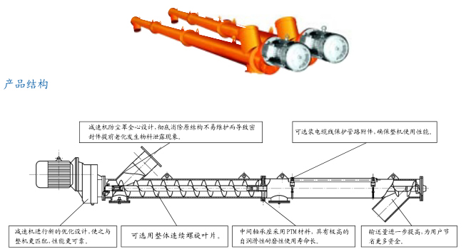 應(yīng)用領(lǐng)域 適用于化工、冶金、建筑、糧食加工等行業(yè)粉粒體的輸送。 例:炭黑、純堿、水泥、化肥、農(nóng)藥、面粉糧食等。 性能特點(diǎn) 一高效率的輸送:小直徑、高轉(zhuǎn)速、變螺距的螺旋體設(shè)計(jì),確保產(chǎn)品在工作過(guò)程中順暢、快速、均勻上料。 一隨意的布置:輸送機(jī)的外殼采用優(yōu)質(zhì)無(wú)縫鋼管通過(guò)法蘭名段連接為整體,故整體剛性好,無(wú)論是水平,還是大傾角均可連續(xù)輸送,并可直接與其配套的設(shè)備連接固定,無(wú)需地基基礎(chǔ),充分利用空間,移動(dòng)、拆裝十分方便。 一良好的潤(rùn)滑:本公司專有PTM材料少油潤(rùn)滑滑動(dòng)瓦加多層迷宮式油封設(shè)計(jì)以及由油泵,分配器,管路形成的集中潤(rùn)滑系統(tǒng),使整機(jī)各運(yùn)動(dòng)付得到充分潤(rùn)滑,從而延長(zhǎng)了整機(jī)的使用壽命。雙重保護(hù),自然更勝一籌。 一可靠的密封:潤(rùn)滑密封可靠無(wú)滲漏,既無(wú)浪費(fèi)物料,又創(chuàng)造了良好的工作環(huán)境,經(jīng)改良的窺視孔裝置無(wú)滲水和物料泄漏之憂。歷經(jīng)風(fēng)雨侵襲卻連續(xù)工作,且少有故障發(fā)生。 一多元化的聯(lián)接:進(jìn)、出料口可采用萬(wàn)向節(jié)、布袋、法蘭聯(lián)接方式。 一創(chuàng)新的設(shè)計(jì):引進(jìn)技術(shù)生產(chǎn)的專用齒輪減速機(jī),先進(jìn)合理的設(shè)計(jì),結(jié)合先進(jìn)制造工藝和完善的質(zhì)量保證體系,使其具有體積小,承載轉(zhuǎn)矩大、噪音低、不滲油等顯著優(yōu)點(diǎn)。 技術(shù)參數(shù)